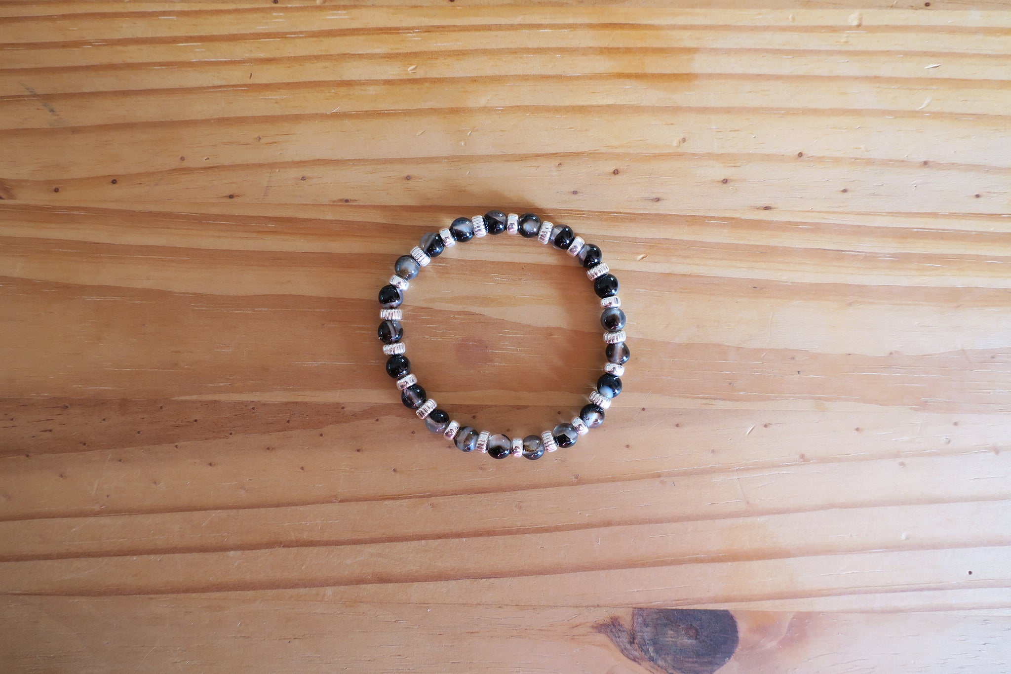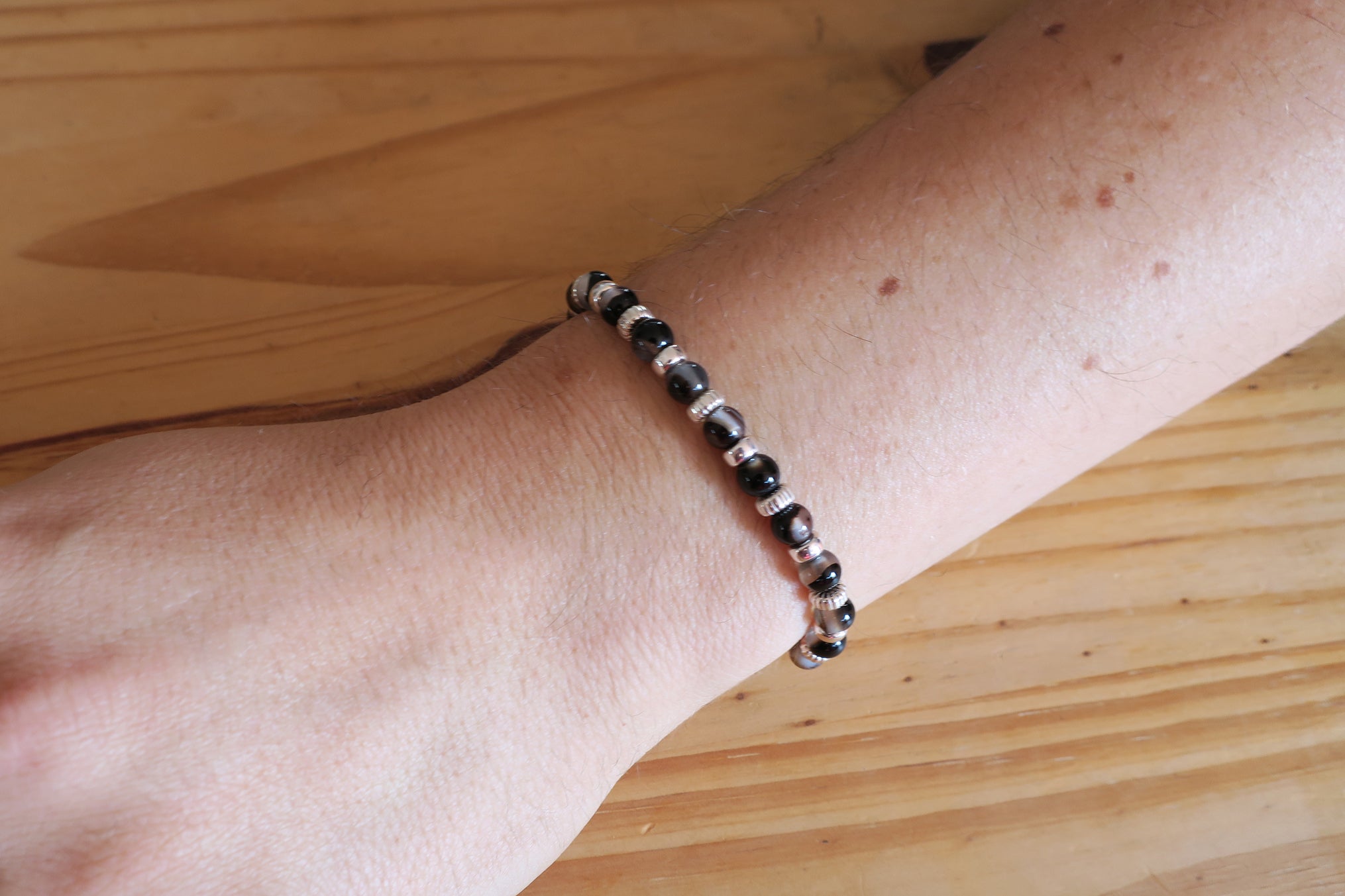 A handsome, handmade bracelet featuring black agate and sterling silver beads. Crafted on latex-free stretchy cord for easy on and off.