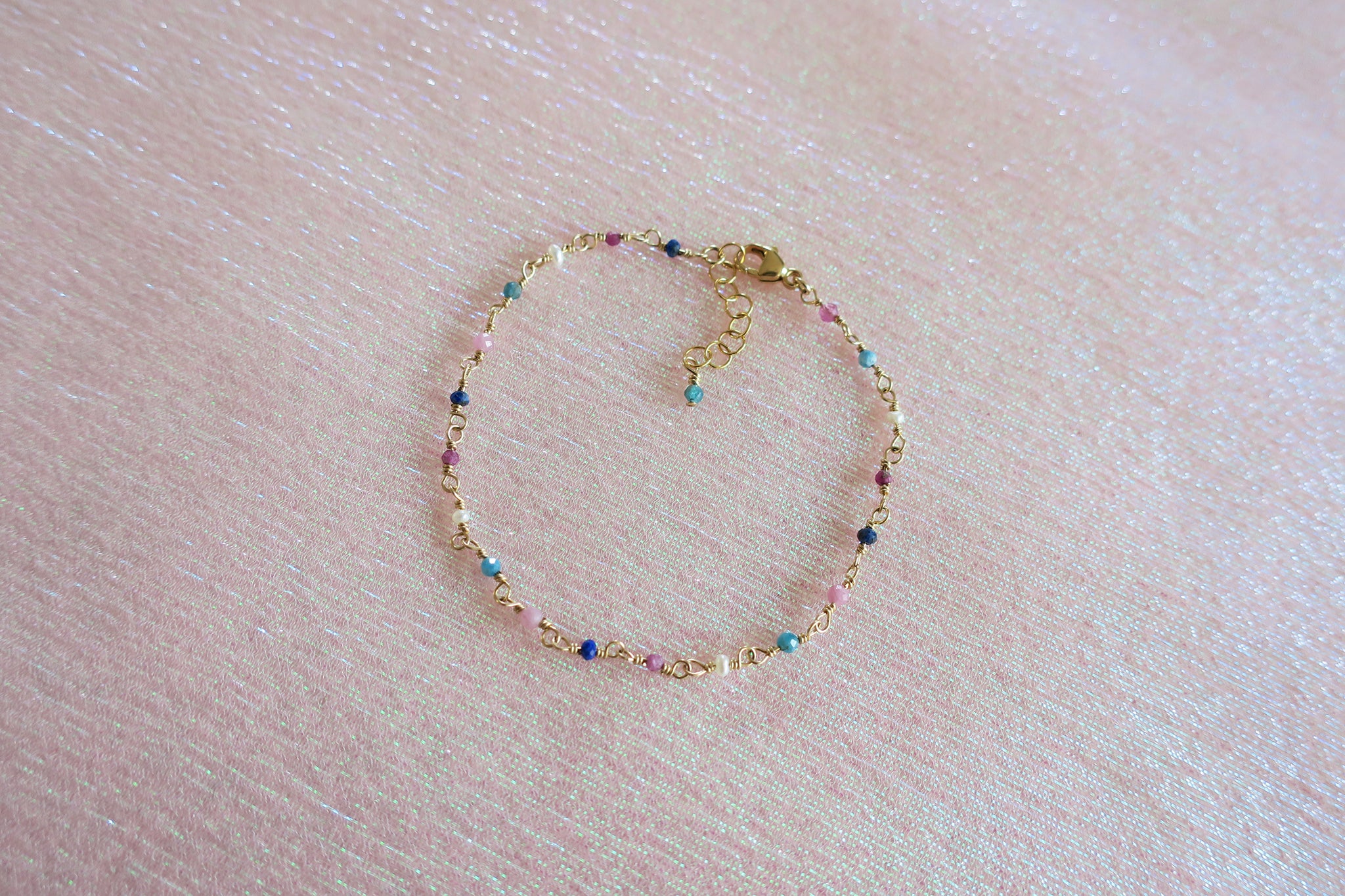 A beautiful, handmade bracelet featuring dainty gemstone beads and freshwater pearls. Each link is meticulously crafted from gold-filled wire.