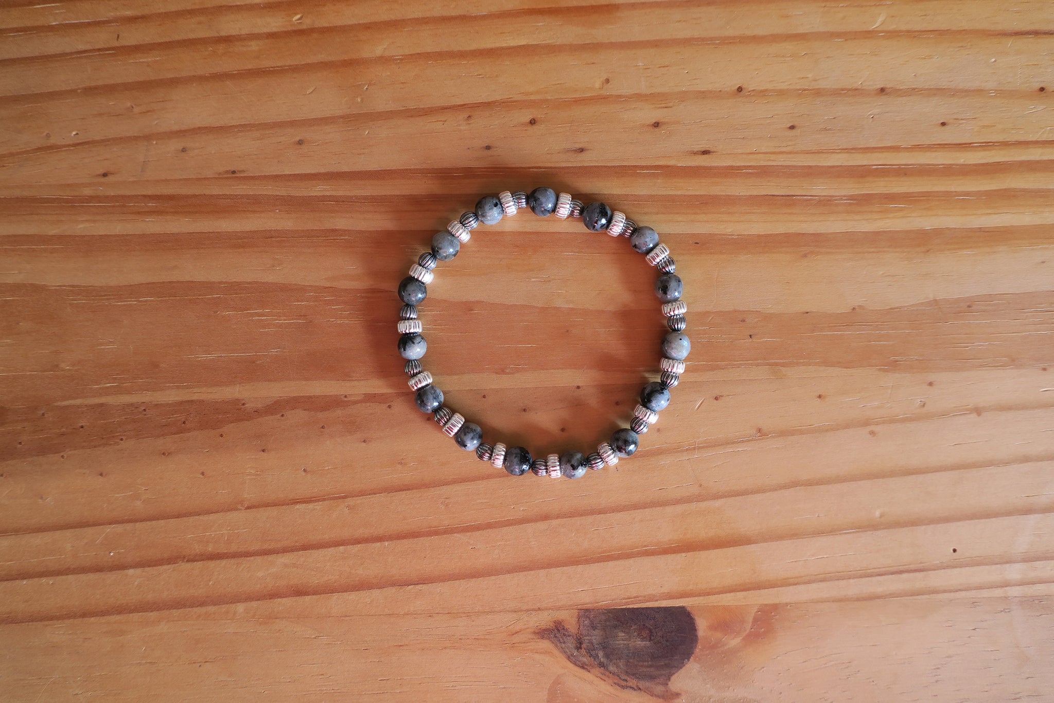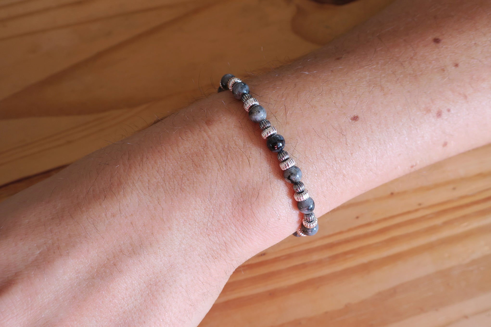 A handsome, handmade bracelet featuring labradorite and sterling silver beads. Crafted on latex-free stretchy cord for easy on and off.